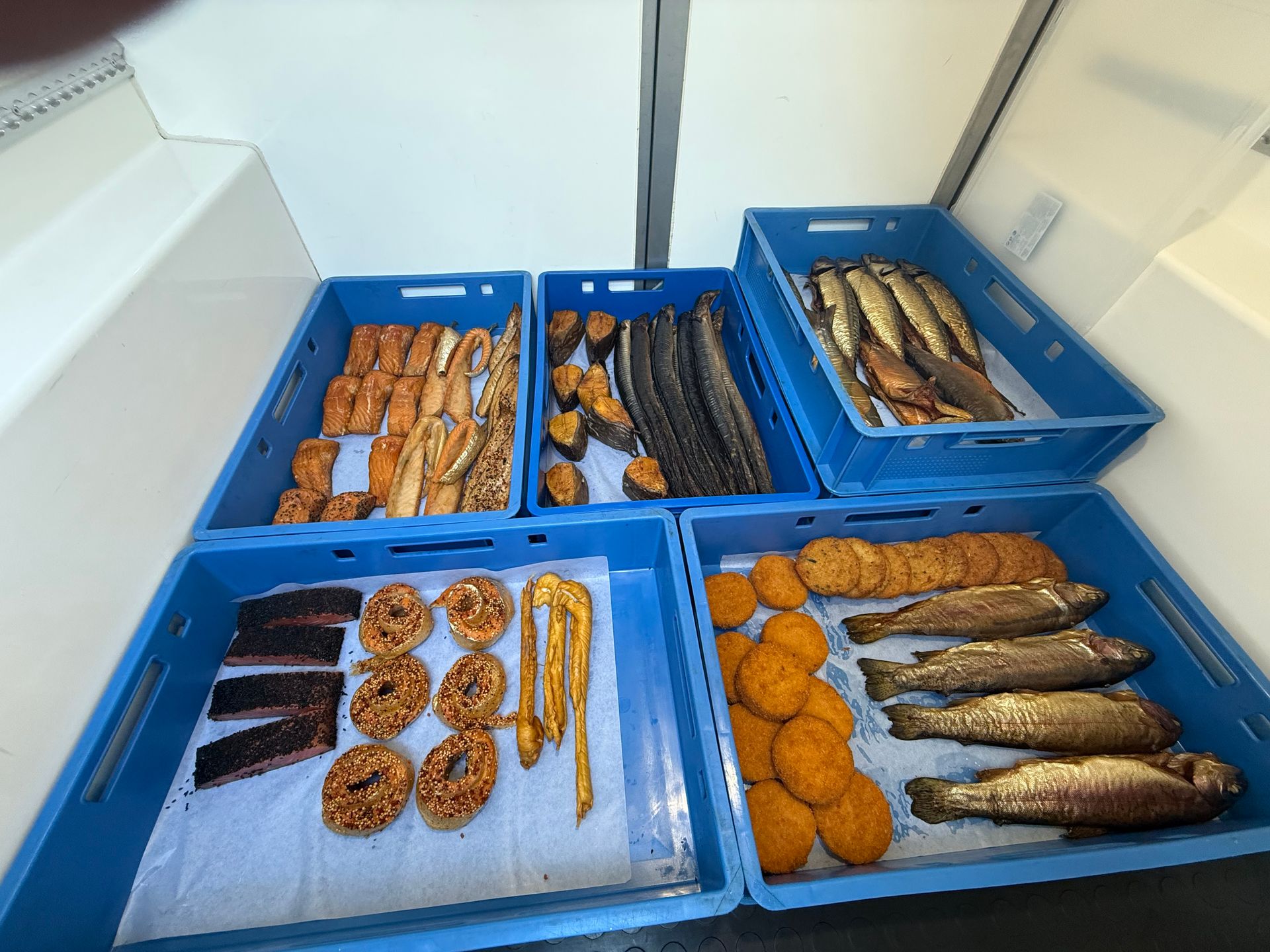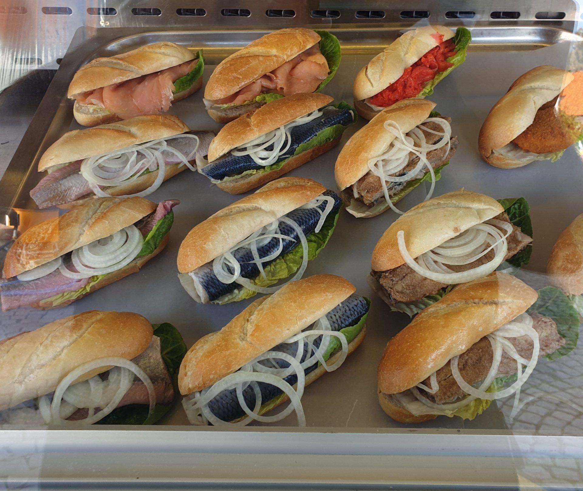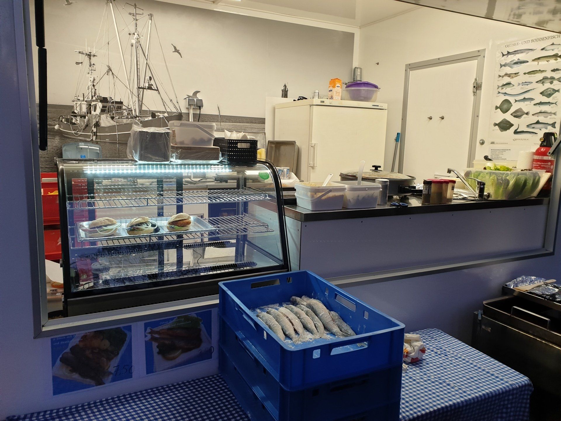 Kühltresen Auslage.: Es werden alle Fischbrötchen frisch vor Ort für Sie belegt. Matjeshering, Brathering, Bismarckhering,Seelachsschnitzel, Lachsbrötchen, Makrelenfilet, Aalbrötchen oder Stremellachsbrötchen mit leckeren Zwiebelringen und schmackhafter Remoulade