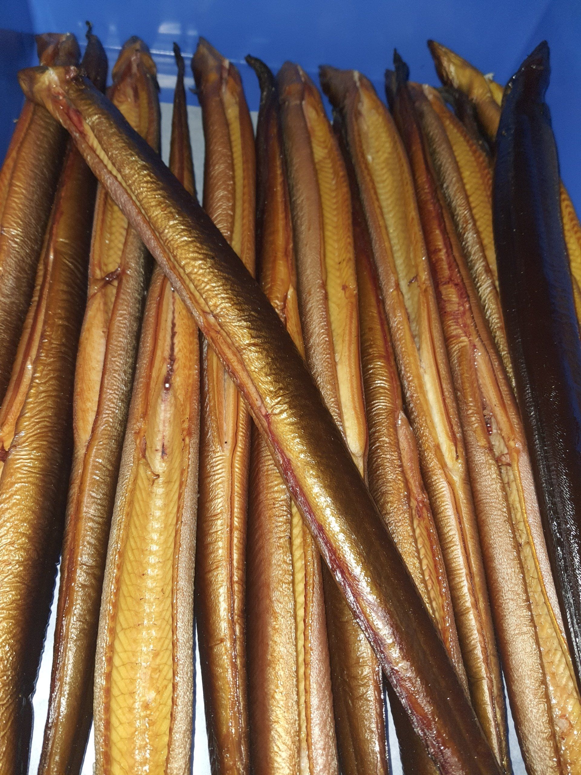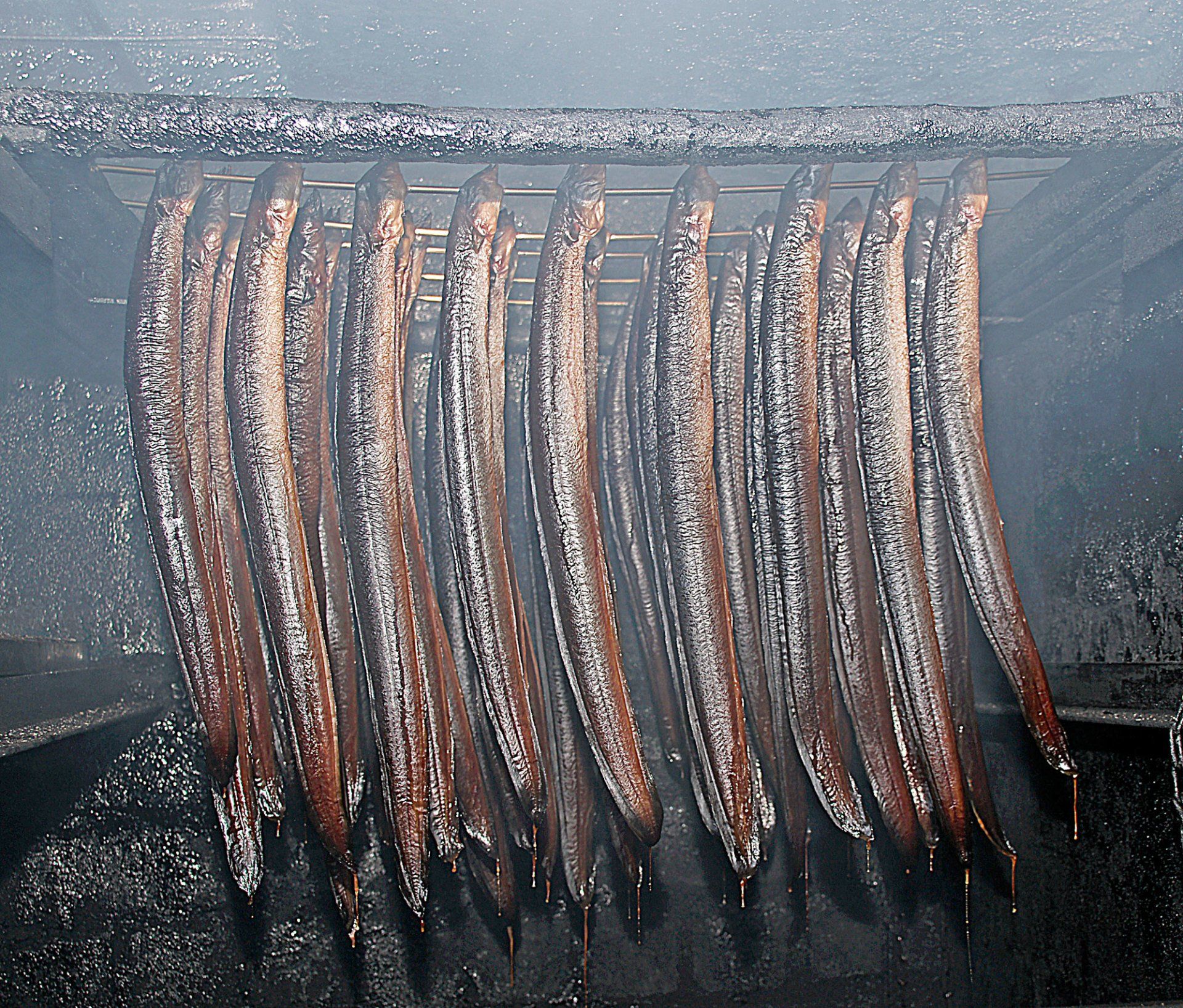 Zu Gast, in der Aalkate Haffkrug. Frisch gefangene Ostseeaale wurden in der Aalkate Haffkrug geschlachtet küchenfertig zugeschnitten und über Buchenholz im Aalrauch geräuchert.